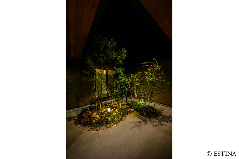 コの字型をした建築の中庭のデザイン。 家中どこからでも見える中庭は四季を感じられるよう落葉樹を植え、陽の光や風の揺らぎを眺める究極の癒し空間になりました。 優しく照らしてくれるライトがお施主様のお気に入りポイントです。