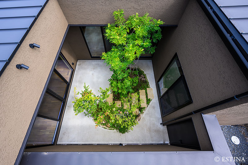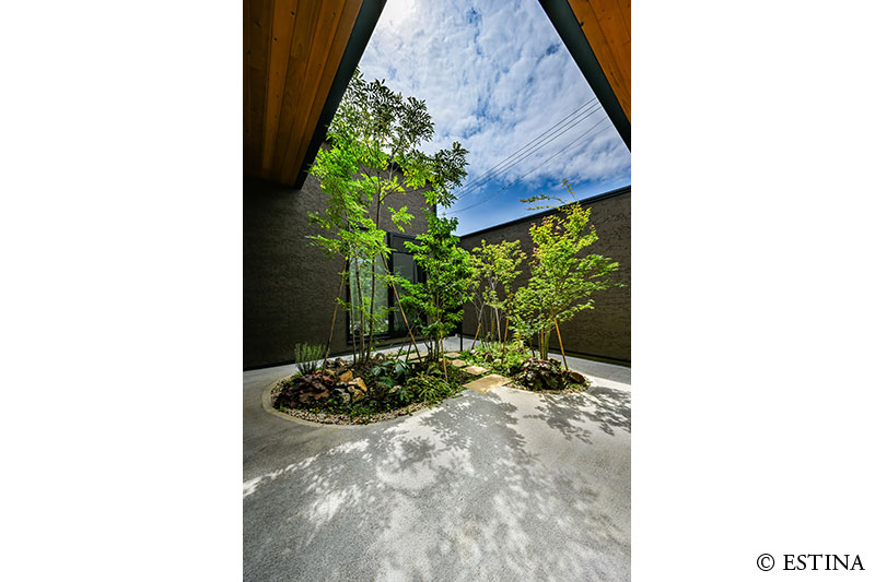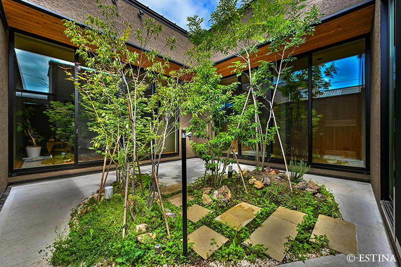 家中どこからでも見える中庭は四季を感じられるよう落葉樹を植え、陽の光や風の揺らぎを眺める究極の癒し空間になりました。